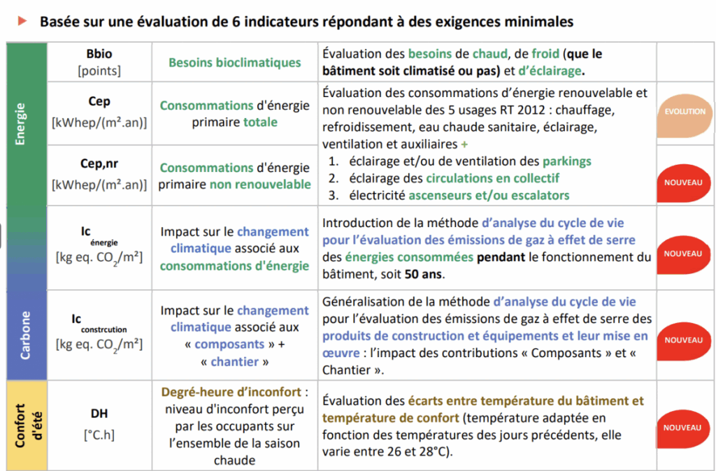La RE2020 repose sur l’évaluation de six indicateurs réglementaires, qui couverent donc désormais l’énergie, le carbone et le confort d’été. Depuis 2025, deux indicateurs supplémentaires sont donc apparus et ils sont indiqués en bleu juste ici 👇